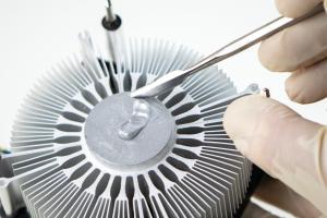 Master Bond EP52TC is a thermally conductive, electrically insulating two part epoxy that combines good physical properties and the ability to transfer heat rapidly and effectively. It uses relatively small thermally conductive particles ranging in size from 5 to 30 microns. Typically, thermally conductive epoxies cannot be applied in thin sections. However, the combination of a high thermal conductivity filler, and thin bond lines, enables the low thermal resistance. Thermal resistance is calculated from the formula R=t/K (where “R” is the thermal resistance, “t”, the thickness and “K” the thermal conductivity of the material). Thermally conductive epoxy usually has a thermal resistance ranging from 30-45 x 10-6 K•m2/W. With EP52TC, the thermal resistance is significantly lower, 10-15 x 10-6 K•m2/W, because of the high conductivity filler and the ultra small particle size. The end result is the epoxy is very effective in transferring heat. The lower the thermal resistance, the better it is for heat transfer properties.