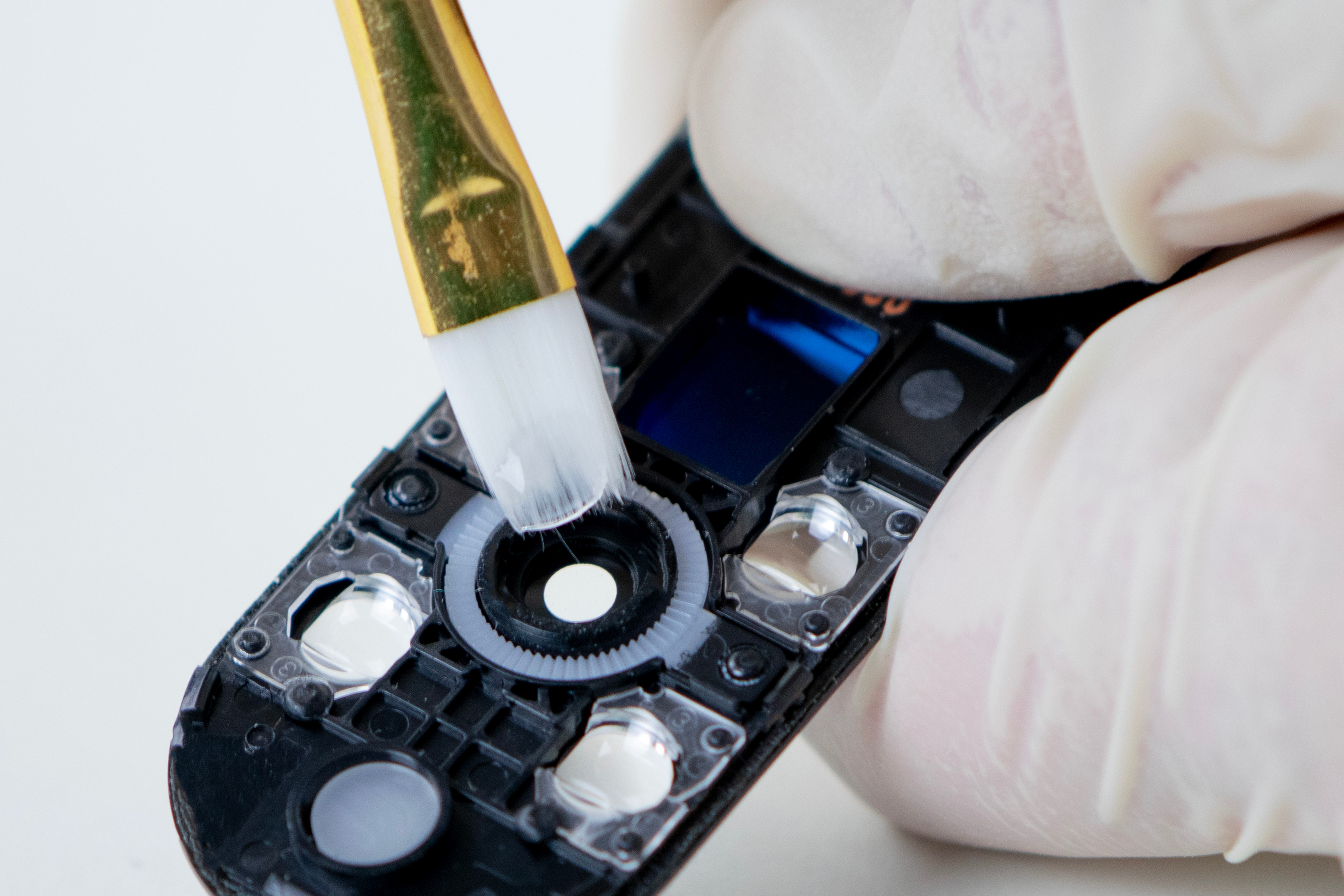 Master Bond UV15-7NV-2 system is not oxygen inhibited and generally cures in 15-45 seconds when exposed to a UV light source emitting at a wavelength of 320-365 nm with an energy output as low as 20-40 milliwatts/cm². The rate of cure depends upon the compound’s distance from the light source, the thickness of the section and the intensity of the light source. It should be noted that the system can cure in sections up to 1/8 inch. However when bonding, sections of a few thousandths of an inch are more than adequate. This system is widely used in optical, fiber-optic, electronic, laser, microelectronic and semiconductor applications.